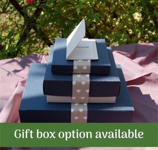 We've designed custom-sized gift boxes to fit our mugs, metal tins, hanging ornaments, fridge magnets, pocket mirrors and keyrings. The boxes are reusable, made using recycled card and tissue paper, and you can include a short message.