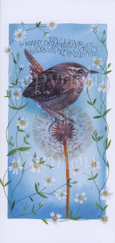 Wren-themed card by Sam Cannon. The design includes a small white border around the edge, and the inside of the card is blank for your own message.