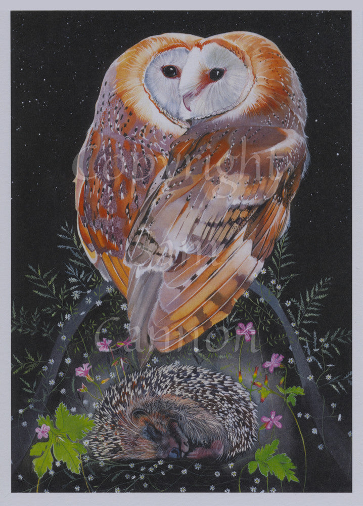 Two owls and hedgehog card by Sam Cannon. The design includes a small white border around the edge, and the inside of the card is blank for your own message.